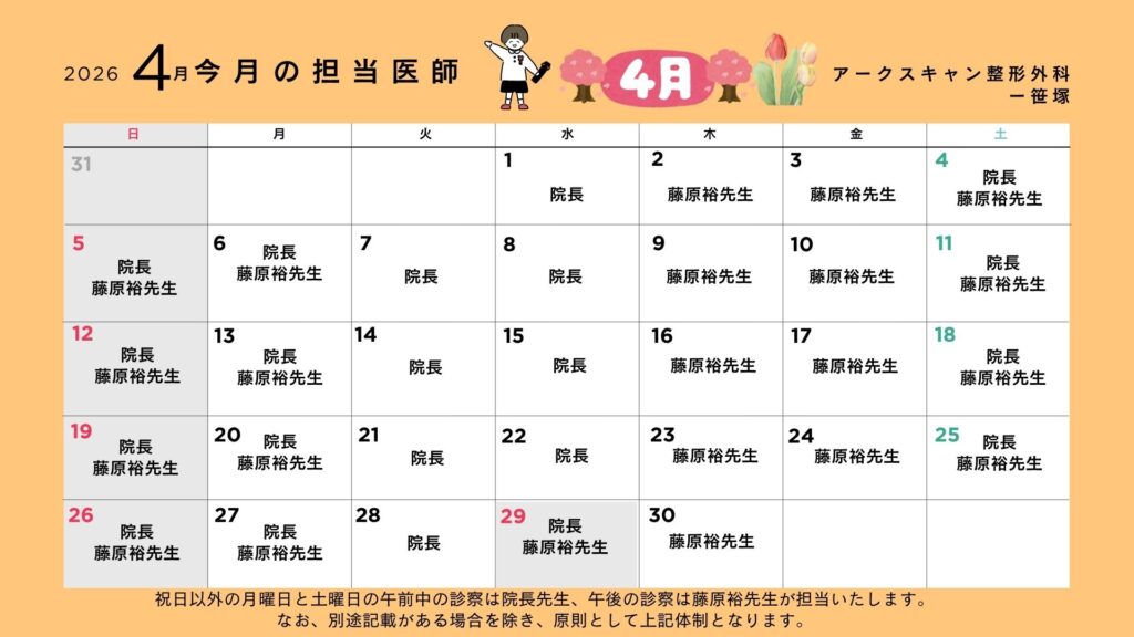 下記は 2026年4月の勤務スケジュール です。受診をご希望の方は、ご予約の際の参考になさってください。